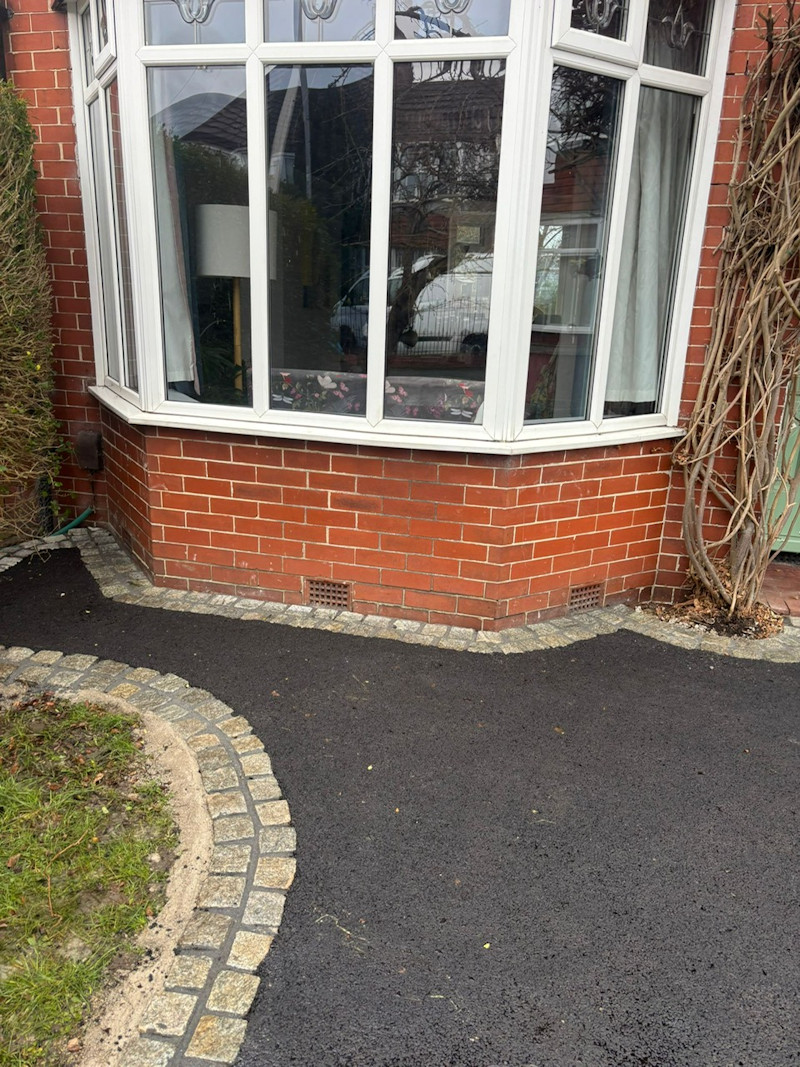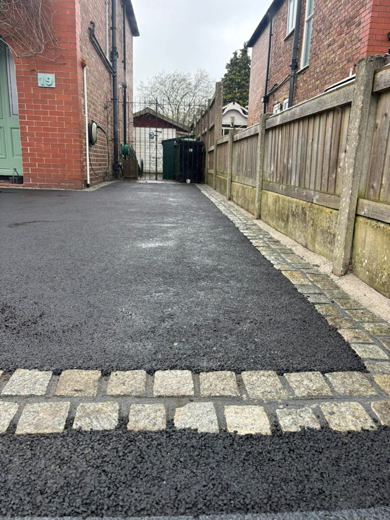 Once this was in place we laid the driveway with 6mm SMA tarmac and picture framed it using granite cobbles. The cobbles define the shape of the tarmac driveway in Sale, Manchester. They are visually striking but from a practical perspective are hardwearing and slip resistant so the perfect choice for finishing off a new driveway in Sale, Manchester. You can see what it looks like from the photographs included.